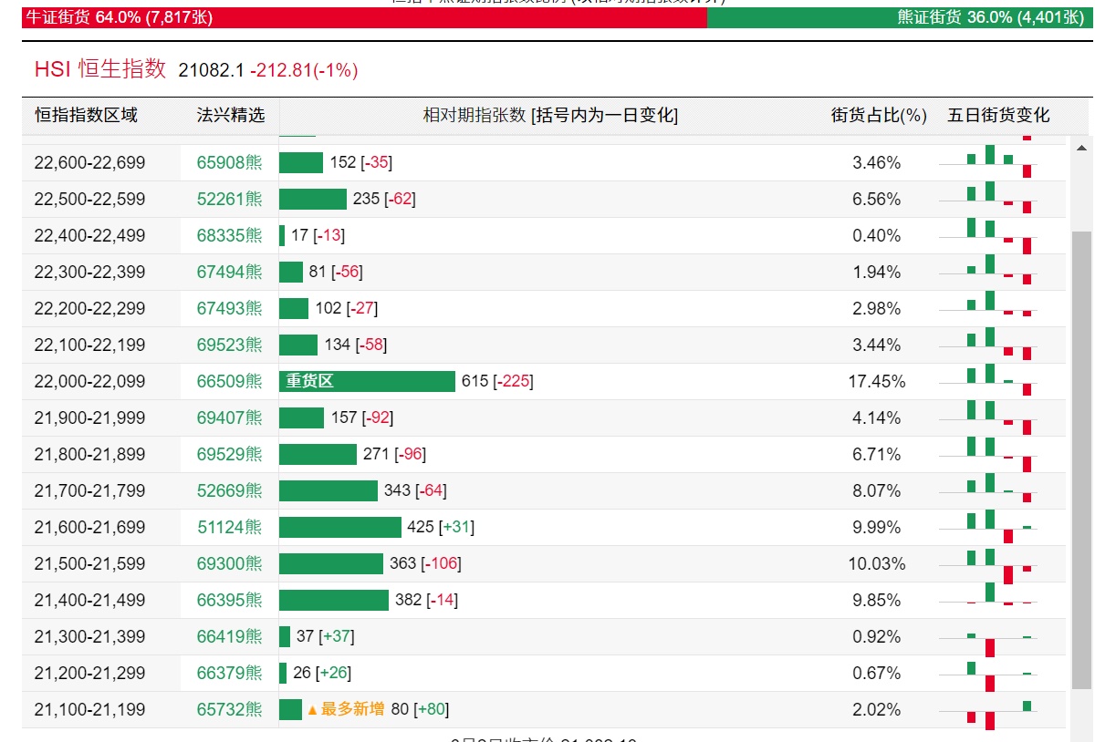 法兴恒指牛熊证街货分布图中的数据显示,熊证街货重货区在22000-22099区间,该区间最新熊证数量为615张,较上一交易日减少225张。最多新增在21100-21199区间,该区间最新熊证数量为80张,较上一交易日增加80张。