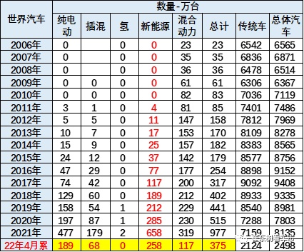 2012年世界广义新能源汽车158万台,到2015年仅有179万台,增长缓慢。随着2016年开始的新能源车加速发展,广义新能源车2016年突破200万台;2017年达到317万台;2018年突破400万台;2020年达到515万台;2021年全年广义新能源车977万台,其中普通混合动力达到319万台;2022年1-4月的广义新能源汽车销量375万台,其中混合动力达到117万台,占比31%。
