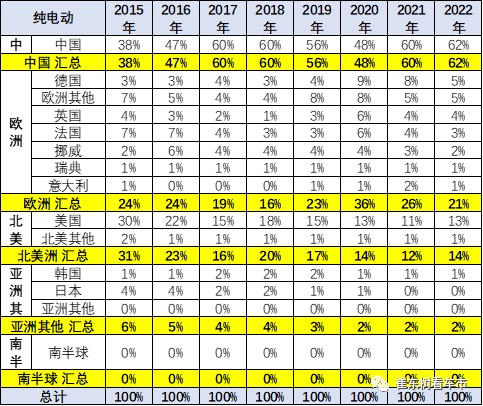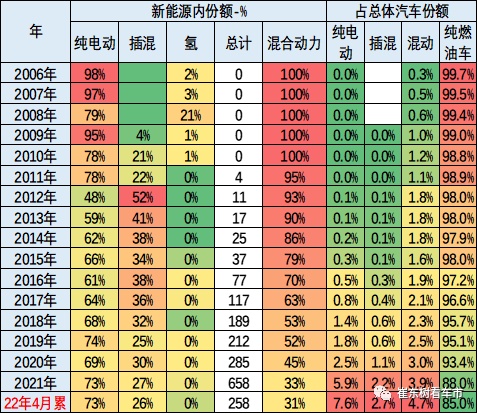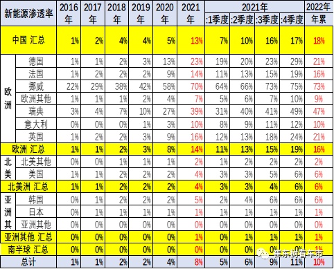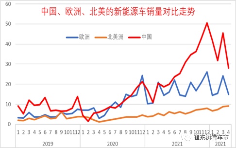 欧洲的纯电动车的份额从2018年的16%上升到2019年23%,2021年上升到36%,到2022年的1-4月份下降到21%的水平。