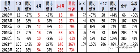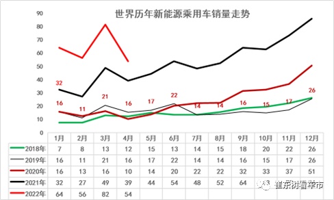 2022年世界新能源车起步较强,1-2月基本实现强势高增长,3月的新能源走势放缓,4月世界新能源销量剧烈走低下降。