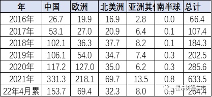 中国2022年1-4月的销量153万乘用车,超越欧洲的70万和北美的32万数倍,中国优势明显。
