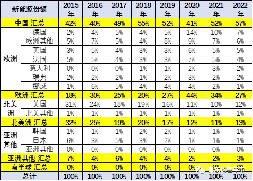 欧洲国家的销量份额变化较剧烈。2020年年末的法国、德国等份额暴增,欧洲随后快速回落。受政策影响不大的是日韩等国家,份额提升较慢的是日本、韩国等,亚洲其他地区的新能源市场增长也是一般。