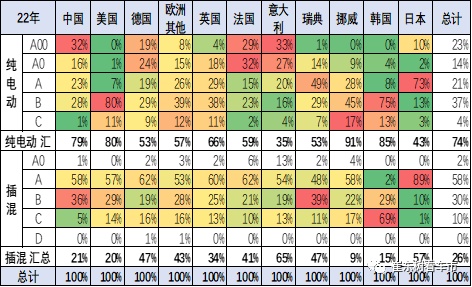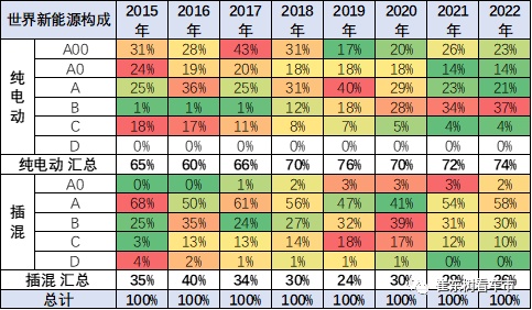 中国纯电动A级车占比提升到23%,远高于德国、法国、意大利的占比,导致世界的架构也是A级车占比提升明显。