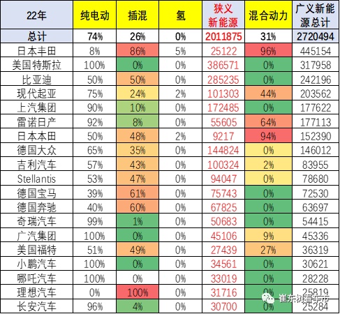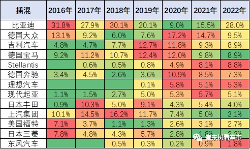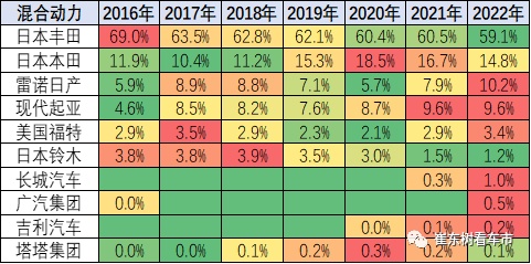 2022年的日产有明显上升,随着东风日产的启动,雷诺日产的份额在10%左右的水平。现代起亚的混合动力份额在世界9.6%左右的水平。