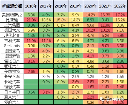 从历年销量份额看,特斯拉保持世界第一,目前持续走强。中国的比亚迪和上汽集团的新能源表现优秀,上汽乘用车和上汽五菱两家自主车企的表现很好。德国大众的新能源车表现较强,2021年受到疫情严重影响,加之去年年末冲刺,年初走势偏弱。宝马集团、德国奔驰等保持在第二梯队水平。