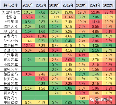 上汽集团的份额从2018年的4.8%上升到2019年7.4%,随后上升到2020年的10.4%和2021年的14.4%的份额,2022年1-4月的的10.2%,表现相对较强。