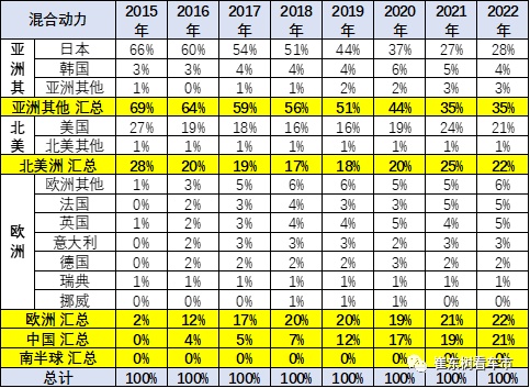 普通混合动力市场中,日本车的混合动力表现相对较强。日本混合动力份额从2016年一路下降到2021年27%的份额,2022年保持到28%的份额。