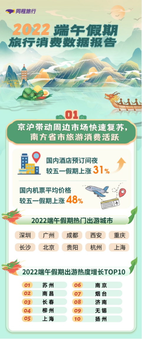 数据还显示,深圳、广州、成都、西安、重庆、长沙、北京、贵阳、杭州、上海为端午假期热门出游城市前十。北京、上海均回归榜单。同程研究院分析认为,随着本轮疫情得到控制,暑期国内商务出行和旅游市场均将迎来客流高峰。