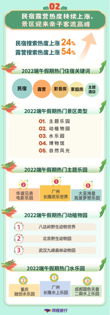 在疫情有效防控和节前各类利好政策的带动下,全国各地跨城、跨省出行较清明和“五一”假期更为活跃,尤其民宿、露营等个性化住宿方式搜索热度持续升高,亲子游成为端午出行的热门主题。