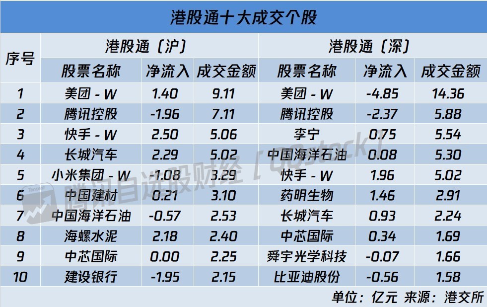 南向资金上个交易日净流入7.02亿港元。港股通(沪)方面,快手-W净买入2.50亿港元,长城汽车净买入2.29亿港元。港股通(深)方面,快手-W净买入1.96亿港元,药明生物净买入1.46亿港元。