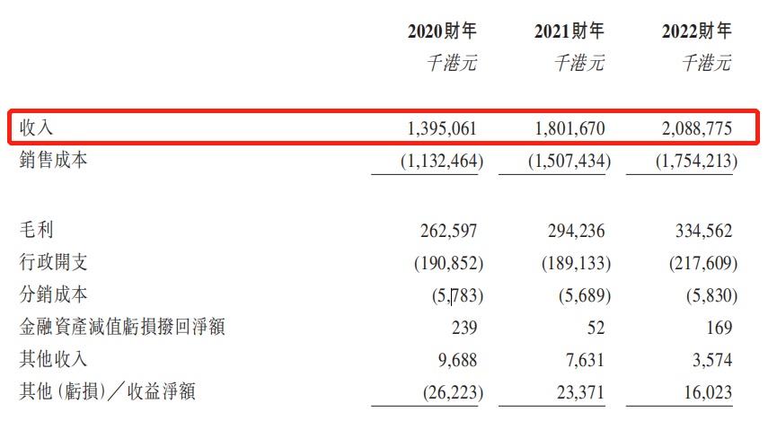 据招股书数据显示,2020财年至2022财年,该公司实现营收分别为 13.95亿、18.02亿和 20.89亿港元,后两个财年分别同比增长29.1%、15.9%;实现净利润分别为 3258.6万、8963.9万和 9478.0万港元,后两个财年分别同比增长175.08%、5.74%。