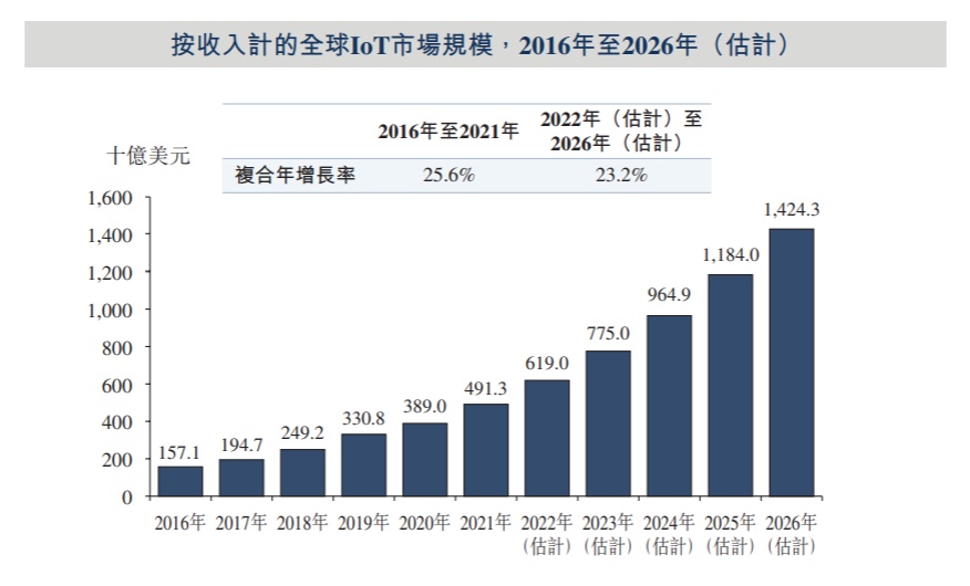 需要指出的是,随着网络基础设施的快速数字化及部署,按收入计,全球IoT市场规模于2016年至2021年以25.6%的复合年增长率显著增长,并预计于2026年市场规模将超过1.4万亿美元。