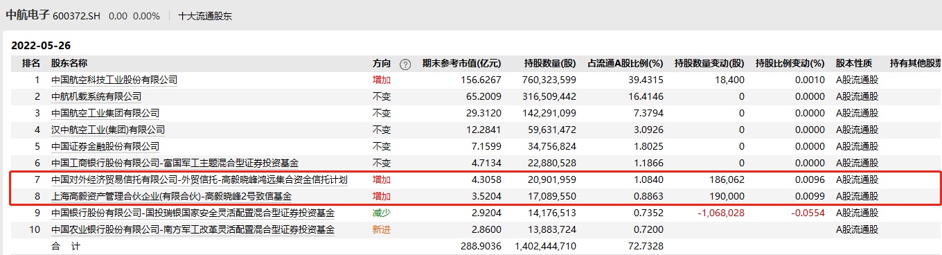 6月3日,中航电子(600372.SH)、中航机电(002013.SZ)拟筹划重组,对此,中航电子、中航机电均披露了最新的前十大流通股东名单。数据显示,对比一季度末,高毅资产邓晓峰在管的两只基金合计增持中航电子约37.6万股,两只基金加总最新持股市值达7.526亿。