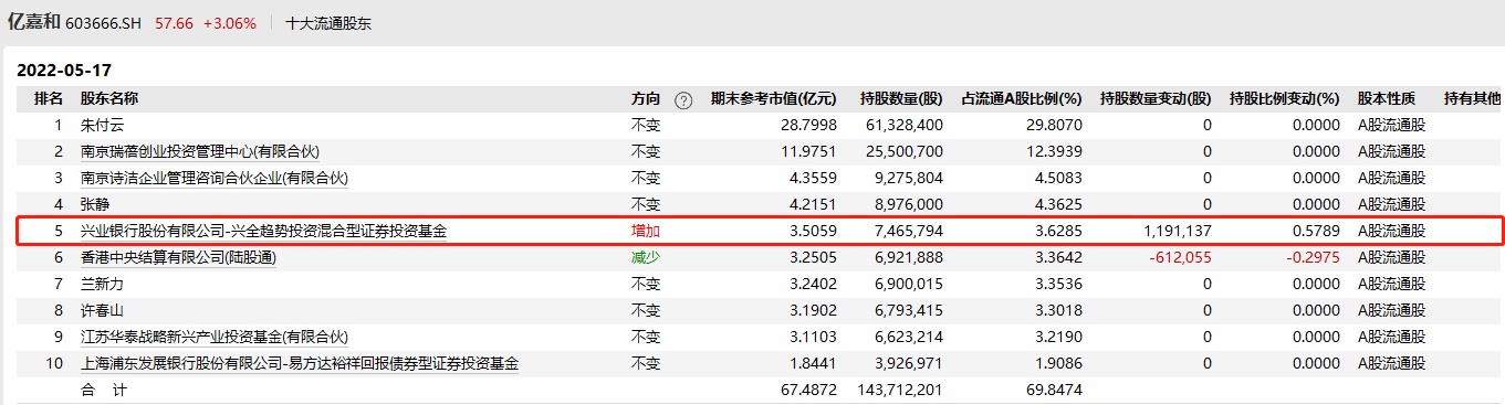 5月中下旬,机器人概念股亿嘉和(603666.SH)因回购披露了前十大流通股东名单。名单显示,谢治宇旗下兴全趋势投资基金加仓约119.11万股,最新持股市值约3.5亿元,位列第五大流通股东。