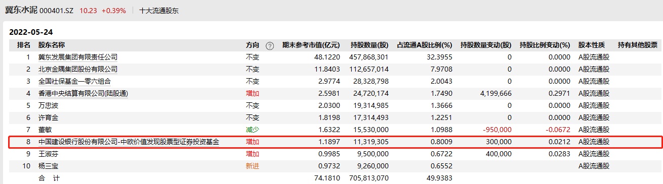 冀东水泥(000401.SZ)最新公告显示,截至5月24日,曹名长管理的中欧价值发现加仓30万股,最新持股市值约1.19亿,目前位列第八大流通股东。