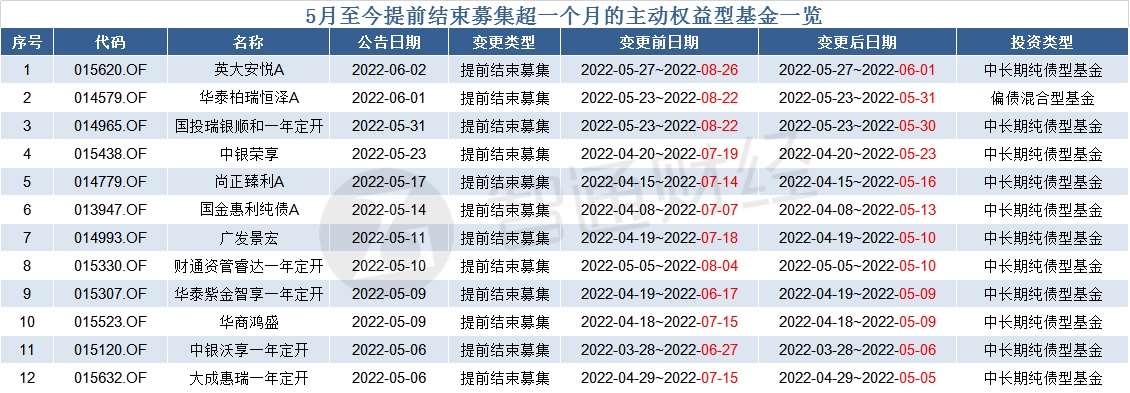 Wind数据显示,五月至今有35只非债基金宣布提前结束募集。值得注意的是,有12只基金提前超一个月结束募集。