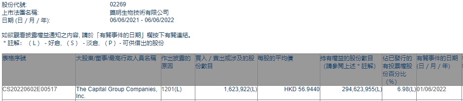 智通财经APP获悉,香港联交所最新资料显示,6月1日,美国资本集团减持药明生物(02269)162.3922万股,每股作价56.9440港元,总金额约为9247.26万港元。减持后最新持股数目约为2.95亿股,最新持股比例为6.98%。