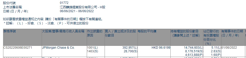 智通财经APP获悉,香港联交所最新资料显示,6月1日,小摩增持赣锋锂业(01772)39.2957万股,每股作价96.6199港元,总金额约为3796.75万港元。增持后最新持股数目约为1474.46万股,最新持股比例为5.11%。