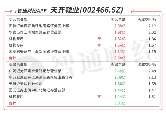 天齐锂业(002466.SZ):龙虎榜阵容豪华,3家机构席位合计净买入2.13亿元,买五是知名游资上海超短的席位买入1.14亿元,当日净买入6896万元,该股今日强势突破箱体,预计走趋势为主。