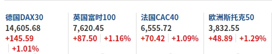 2. 截至发稿,德国DAX指数涨1.01%,英国富时100指数涨1.16%,法国CAC40指数涨1.09%,欧洲斯托克50指数涨1.29%。