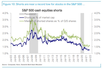 德银在6月3日的报告中表示,押注股价下跌的信号空头兴趣接近纪录低点。事实上,与股市市值相比,整体做空兴趣并没有从多年来的下降趋势中出现太大变化,而是处于20年来的低点附近。