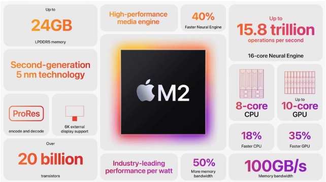 其中最值得关注的当属M2芯片。据了解,苹果M2芯片采用了5 nm制程,集成了200亿个晶体管,比M1多25%,CPU速度提高18%,GPU速度提高35%。