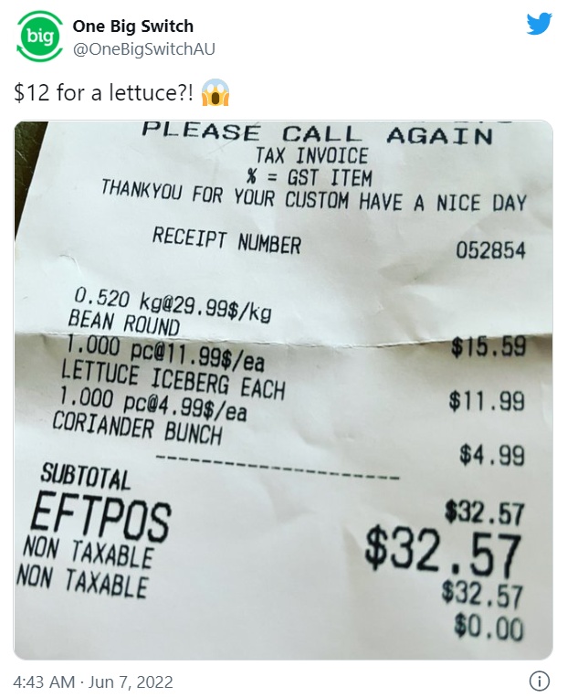 事实上,除了生菜外,该地区的其他蔬菜和水果的价格也在飞涨。消费者们对此纷纷在社交媒体上发泄情绪,表示要花12澳元(约合8.61美元)才能买一棵卷心莴苣,其他农产品的价格则更高,一个西瓜的价格高达25澳元。