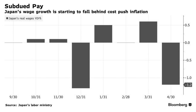 据悉,日本政府周二早些时候发布的一份报告显示,日本4月实际薪资收入年率出现四个月来的首次下降,进一步表明成本推动型通胀正在侵蚀消费者的购买力。而由于受到能源和大宗商品价格的影响,今年的通胀率预计将在2%左右徘徊,实际工资可能会继续承受强劲的下行压力。而日本央行4月份的一项调查显示,约82.1%的受访者认为物价上涨是不利的,只有2.9%的人认为物价上涨是有利的。