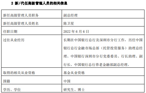 之前,陈卫星长期在中国银行总行及深圳市分行工作,历任中国银行总行金融市场总部(托管投资服务)助理总经理、中国银行深圳市分行党委委员、行长助理、副行长、中国银行总行养老金融部副总经理。加盟中银基金后,陈卫星或将加强公司的养老和金融业务。