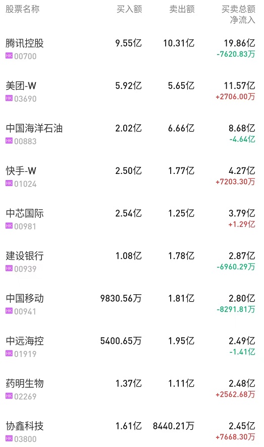 此外,腾讯(00700)、美团-W(01024)分别获净买入2.89亿、1472万港元。而中海油(00883)、中移动(00941)、建设银行(00939)分别遭净卖出1.98亿、8291万、6960万港元。