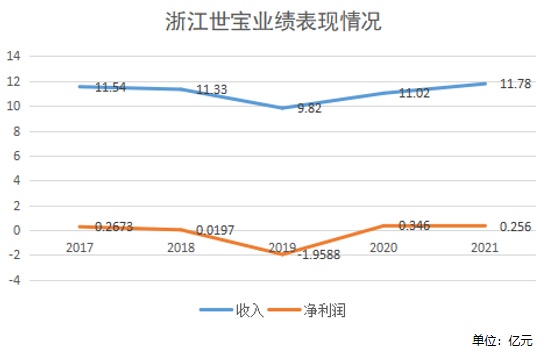 通过上述两组数据来看,可见最近5个年度浙江世宝的收入大致呈V字型,而净利润则在2018、2019年连续两年下滑,2020年虽然成功扭亏,但至2021年则出现了增收不增利的尴尬。