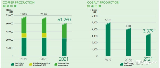 在开采端,近年来金川国际的铜、钴产量逐年下滑,2021年全年共生产61,260吨铜及3,379吨钴。