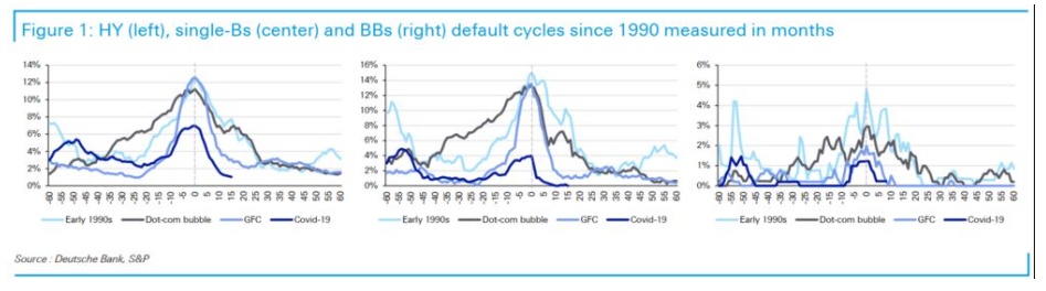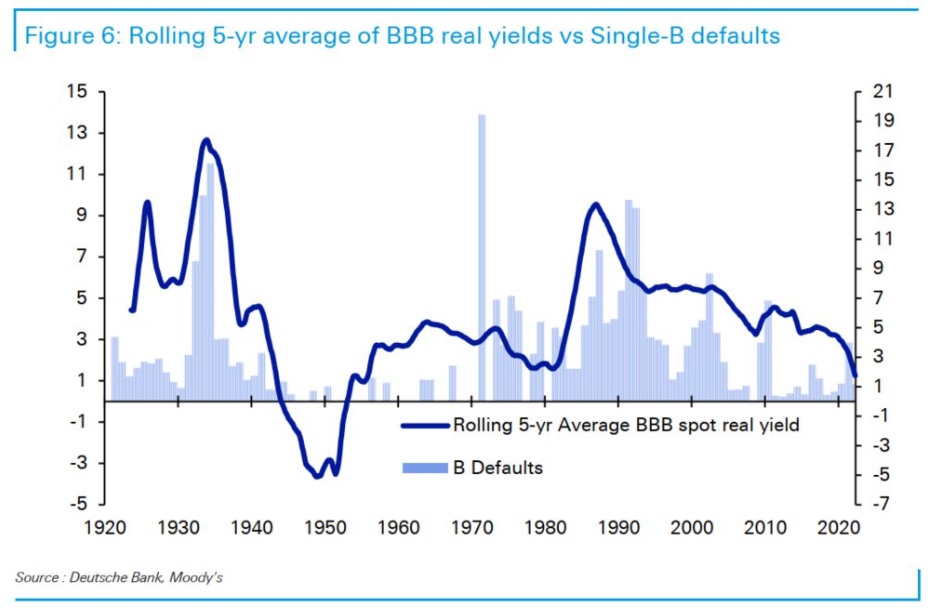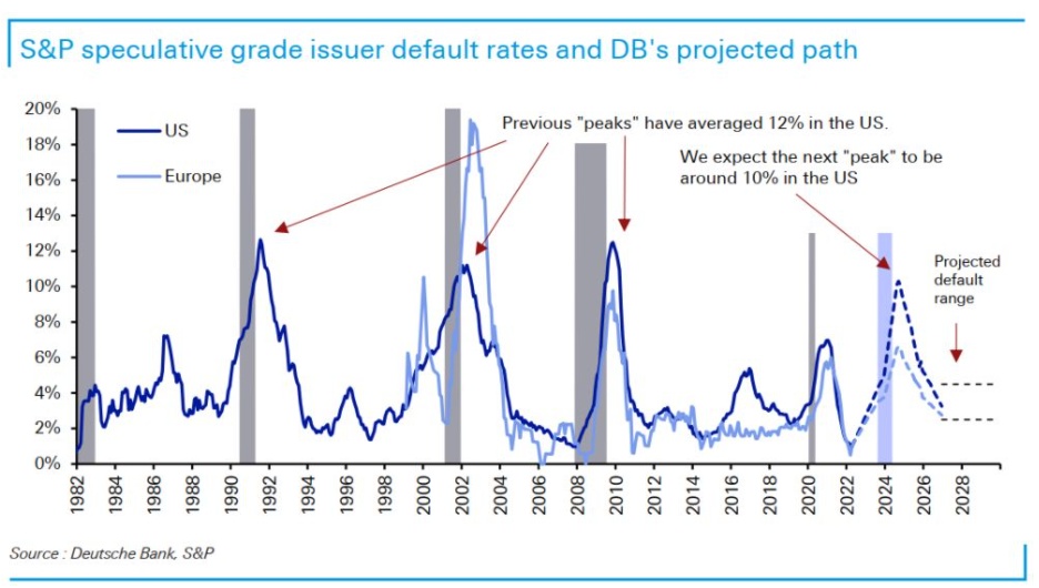 除非通货膨胀率迅速回到2%的目标,否则未来的任何救助都必须与之前的不同。这使得德意志银行预测,从明年晚些时候开始,违约率将再次大幅飙升。 如果通胀确实迅速得到控制,那么美联储可能会再次出手拯救,而周期模式将会重复——但一切都取决于价格上涨。