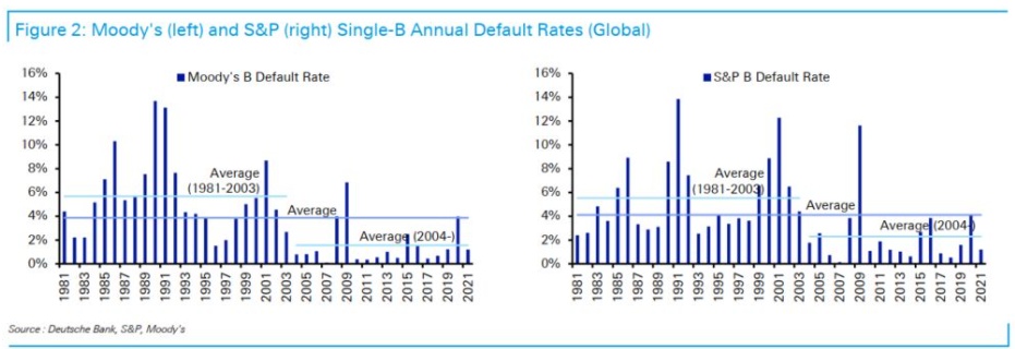 另一种方法是比较不同评级债券在一段时间内的最终违约率。 无论你关注的是穆迪评级还是标普评级,两者都清楚地表明,自互联网泡沫破裂后开始的这个周期以来,违约率一直很低: