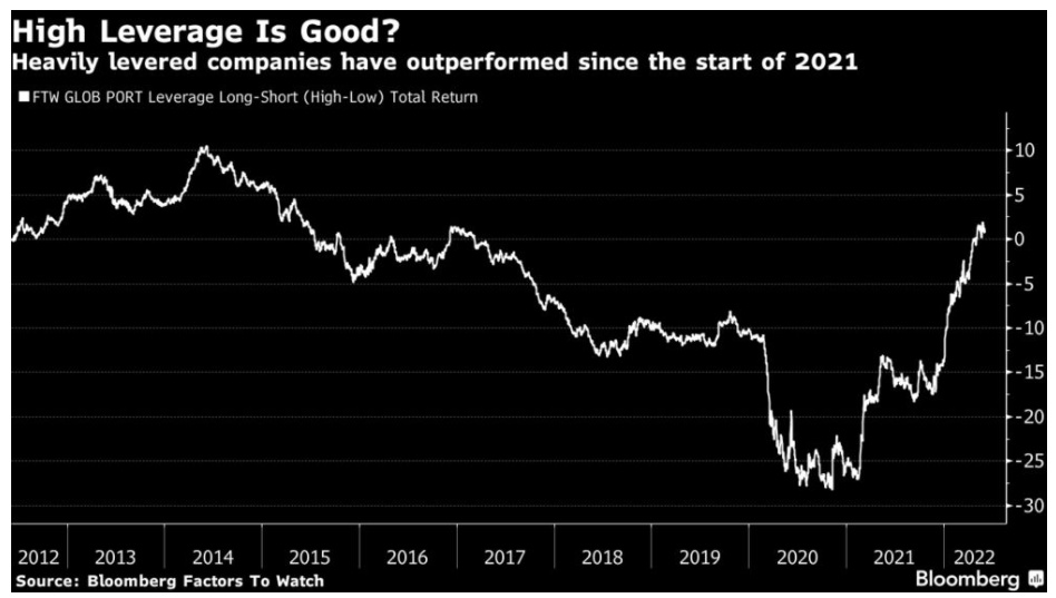 正如彭博观察指数所示,这是一个在全球范围内的基本相同的现象。这个指数展示了全球杠杆率最高的五分之一股票与杠杆率最低的股票表现对比: