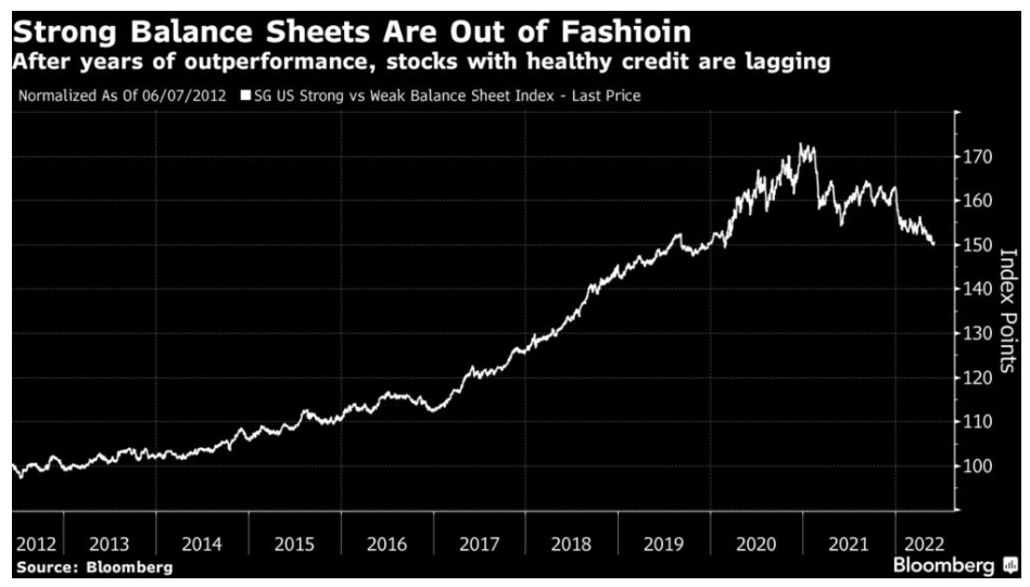 如果你不认为通胀能否得到控制,那么资产负债表强劲的公司的股票似乎存在一个有趣的投资机会。 这就是法国兴业银行的指数在过去10年的持仓——做多资产负债表强劲的公司,同时做空资产负债表较弱的公司: