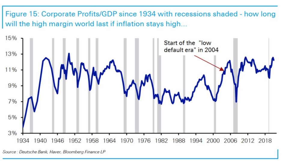 伴随着低违约时代的是非常高的盈利能力。由于企业融资成本低,而且没有理由担心破产,盈利变得容易得多。这是德意志银行自1934年以来的美国利润率图表: