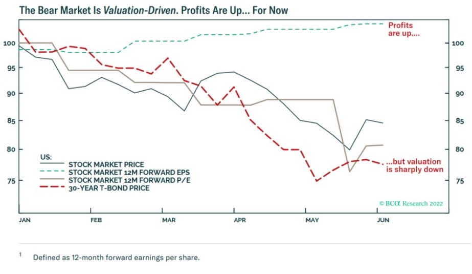 言下之意是,软着陆仍可能对企业利润产生可怕的影响。 今年到目前为止,还有一个不利因素为显现,那就是盈利。 据媒体报道,自1月1日以来,美国经济增长预期已经提高了约3%。 迄今为止,股市抛售的主要原因是估值下降,而债券收益率上升又推动了估值下降: