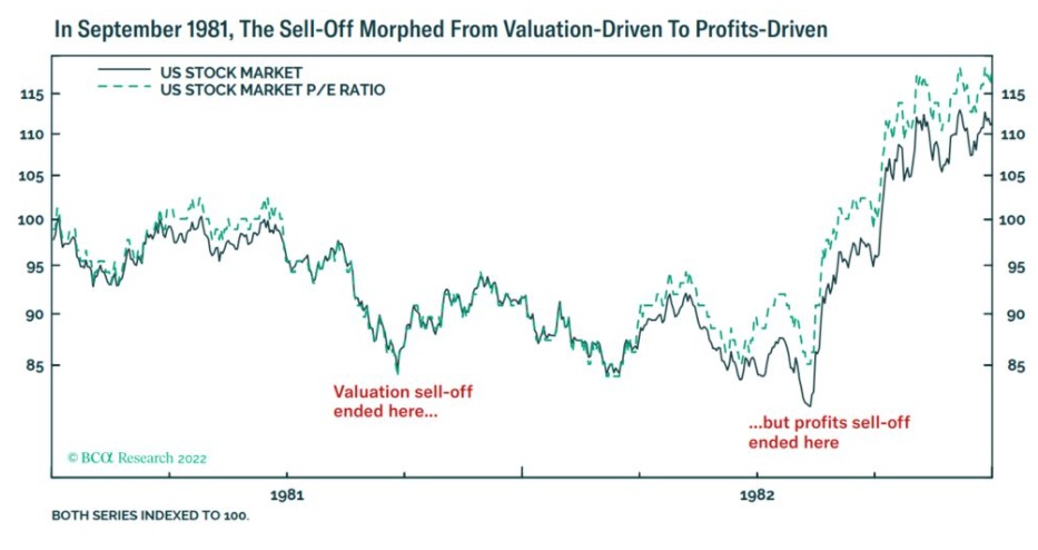盈利上升意味着利润下降的路还很长,即盈利下降的冲击还未到来。因此,即使经济实现了相对软着陆,股票投资者也有可能像他们的债券投资者一样,从现在开始面临更多损失。Joshi用1982年结束的美股熊市做了一个类比。随着估值驱动的抛售转变为盈利驱动的抛售,在低市盈率后的近一年后,股市触底。不过,一旦收益触底,事实证明股市就迎来了历史上最大的长期买入机会之一: