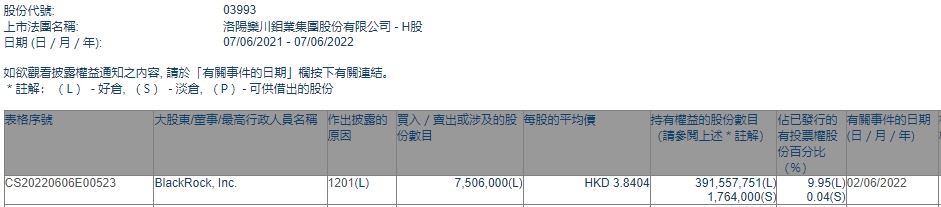 智通财经APP获悉,香港联交所最新资料显示,6月2日,贝莱德减持洛阳钼业(03993)750.6万股,每股作价3.8404港元,总金额约为2882.60万港元。减持后最新持股数目约为3.92亿股,最新持股比例为9.95%。