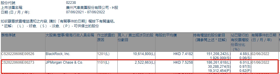 智通财经APP获悉,香港联交所最新资料显示,6月1日,小摩增持广汽集团(02238)252.2663万股,每股作价7.5258港元,总金额约为1898.51万港元。增持后最新持股数目约为1.86亿股,最新持股比例为6.01%。