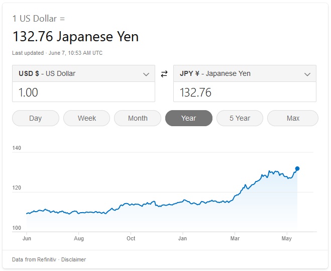智通财经APP获悉,日元兑美元汇率已跌至20年来低点。截至发稿,日元兑美元汇率为1美元兑132.76日元。