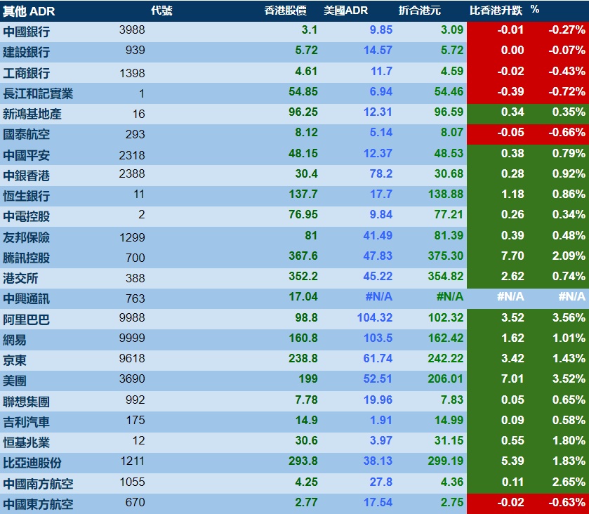 智通财经APP获悉,周二美股三大指数悉数上涨,港股ADR指数上涨,按比例计算,收报21825点,较香港收市涨294.49点或1.35%。