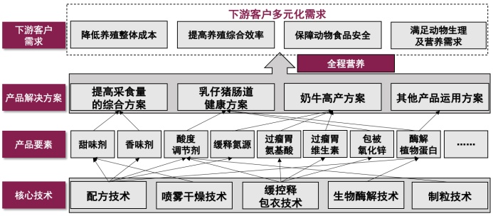 此外,在产品应用方案的研发优势方面,公司针对不同客户的需求,结合“全程营养”理论,以公司自主核心技术为支撑、以公司丰富的产品线为要素,为客户制定综合解决方案,如“提高采食量的综合方案”、“乳仔猪肠道健康方案”、“奶牛高产高效方案”等,公司产品运用方案逻辑框架如下: