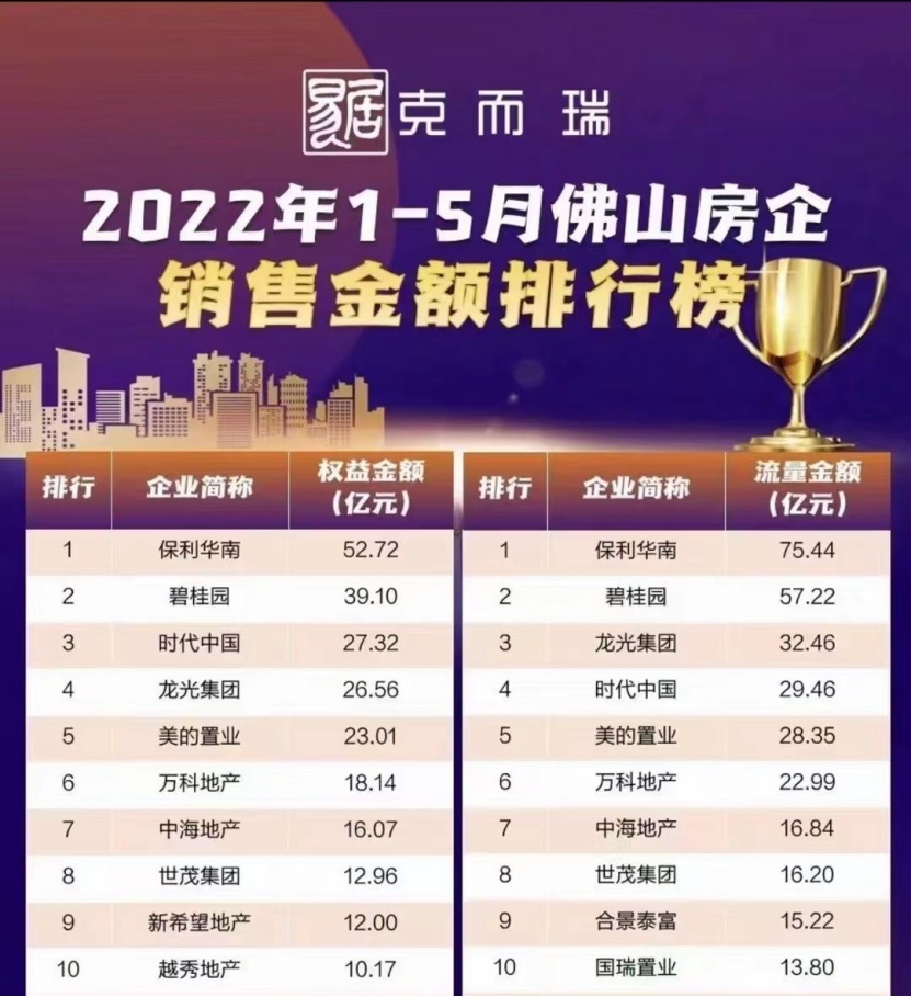 顺应广佛同城化趋势,龙光集团(03380)聚焦深耕佛山,持续保持市场领先地位。6月7日,克而瑞发布《2022年1-5月佛山房企销售排行榜》,龙光流量销售金额位居当地市场第三位。