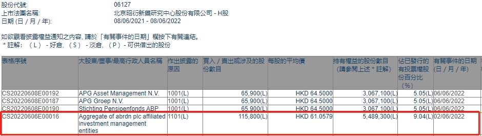智通财经APP获悉,香港联交所最新资料显示,6月2日,Aggregate of abrdn plc affiliated investment management entities增持昭衍新药(06127)11.58万股,每股作价61.0579港元,总金额约为707.05万港元。增持后最新持股数目为548.93万股,最新持股比例为9.04%。