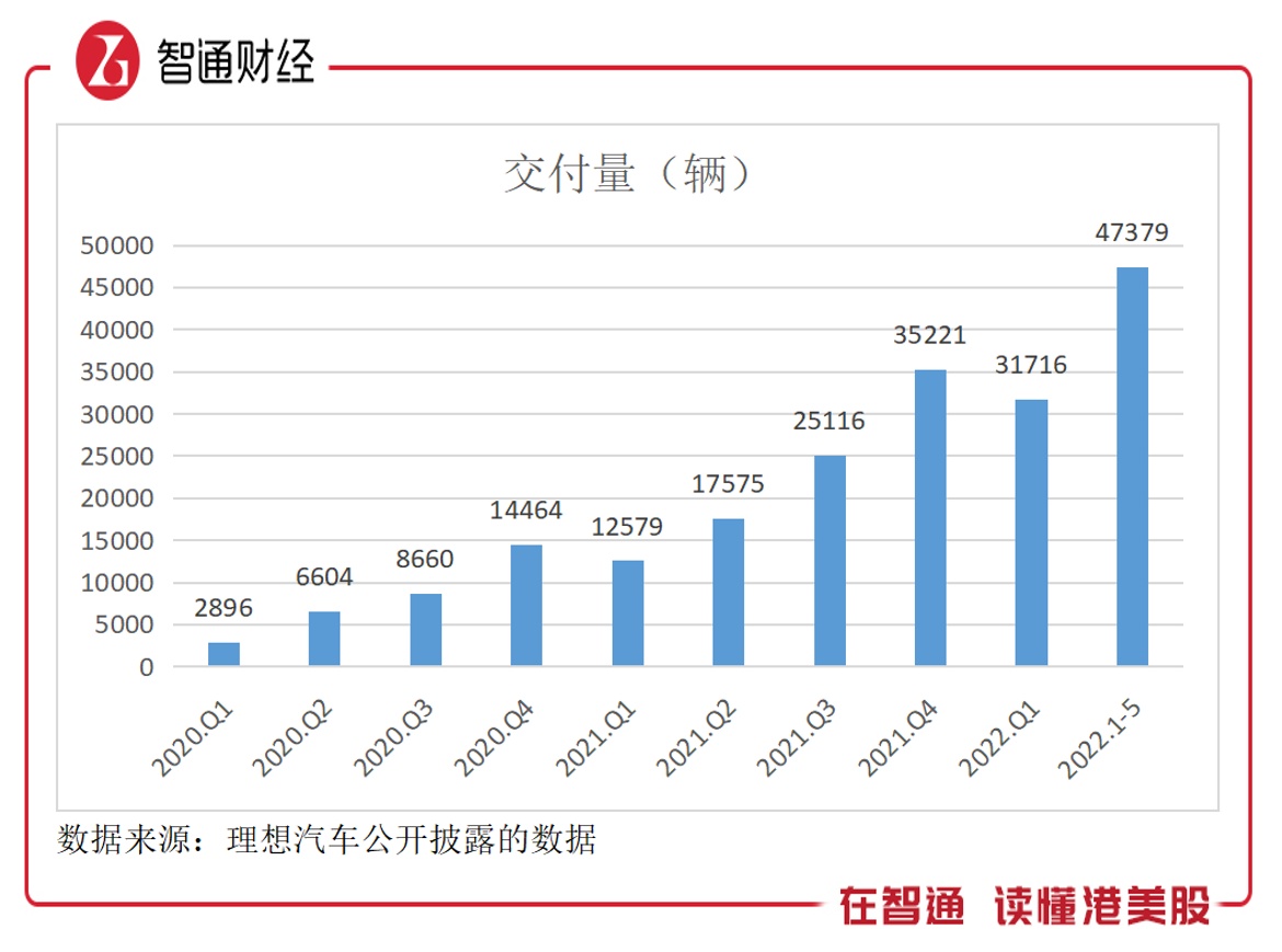 理想ONE是过渡性车型,售价在35万元左右,刚推出时品牌度低,销量缓慢爬坡,经过几年的市场及品牌推广,2022年前五月平均每月销量几乎破万,销量足以跟10-20万的中低端车比拼。从业绩上看,理想汽车按季度收入保持翻倍增长,2021年收入规模270.1亿元,2022年Q1为95.62亿元,同比增长167.45%。