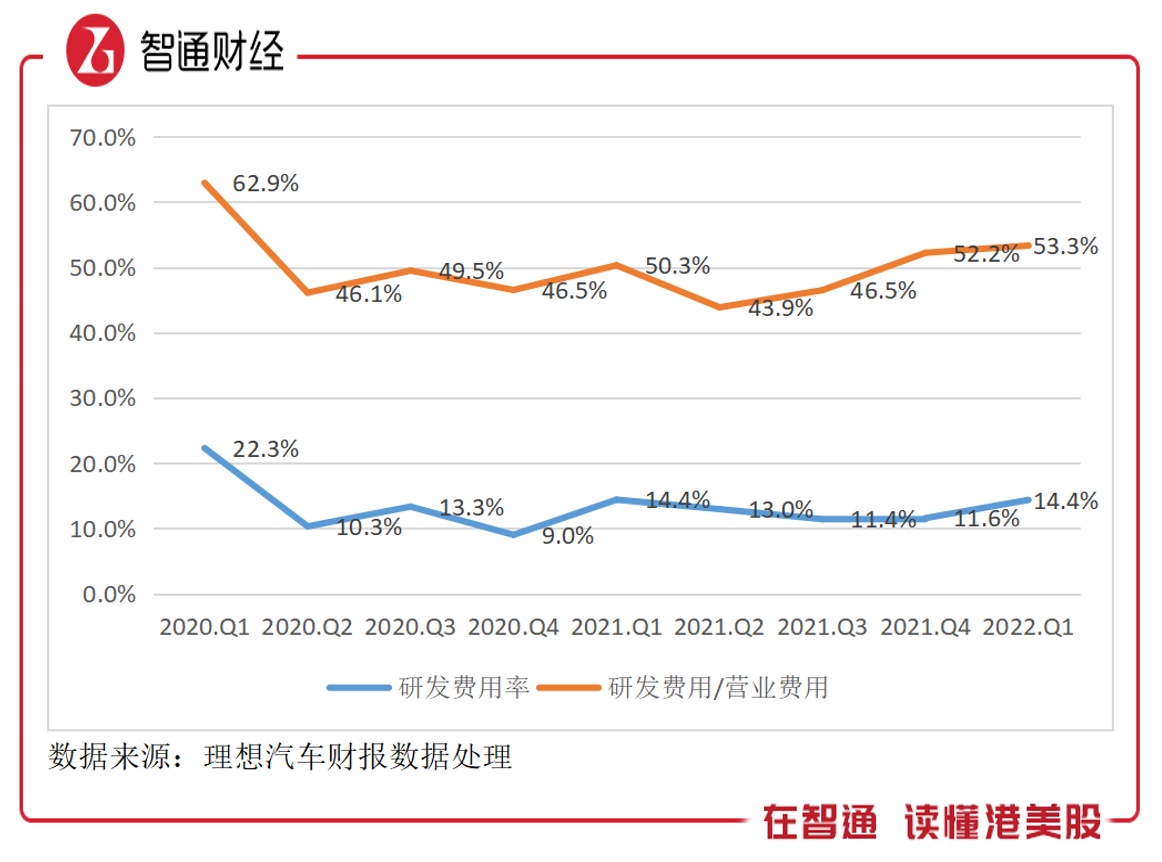 由于增量空间大,造车新势力收入基本都高增长,但不同的是理想汽车注重成本管理,从产生收入到现在,毛利润一直正,且毛利率处于持续上升的趋势,2022年Q1,毛利率为22.6%,在汽车行业中处于领先水平,相比于2020年Q1提升了14.6个百分点。参照汽车行业各项费用水平,该公司盈利并不困难。