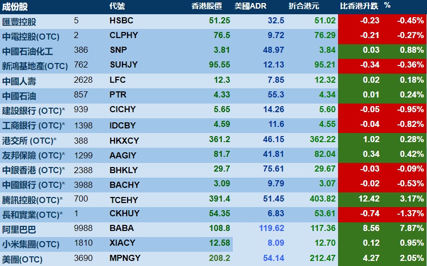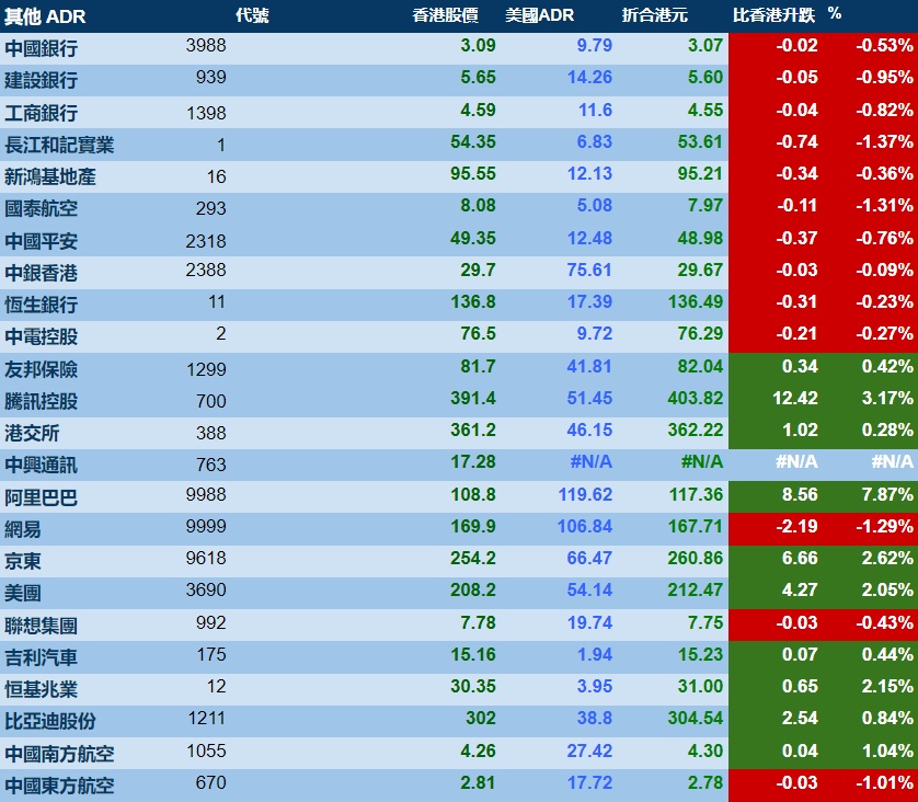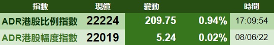 智通财经APP获悉,周三美股三大指数悉数下跌,港股ADR指数上涨,按比例计算,收报22224点,较香港收市涨209.75点或0.94%。