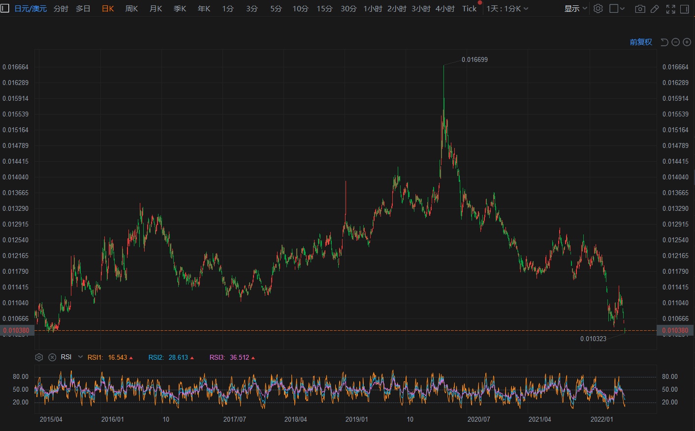 在澳大利亚联储本周公布远超预期的加息措施之后,澳元汇率得到大力提振,日元兑澳元汇率目前处于2015年以来的最低水平附近。